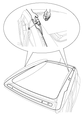 Open the space between chassis and panoramaroof using flathead screwdriver, and then cut the sealant of rear using a tool (09816-2P121, 09816-2P122) (B).
