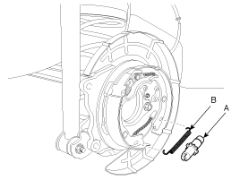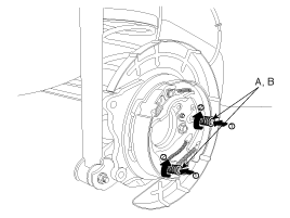 Remove the shoe hold down pin (A) and the spring (B) by pushing the retainer spring and turning the pin.