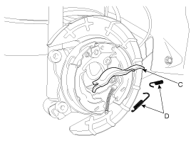 Install the shoe hold down pin(C) and the spring(D) by pushing the retainer spring (D) and turning the pins.