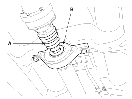 Check the center bearing(B) for excessive play or rattle and rubber for rent. If the center bearing(B) has excessive play or rattle and rubber has rent, replace the propeller shaft assembly.