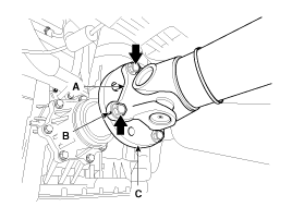 After making a match mark (B) on the flange yoke (A) and transaxle companion (C), remove the propeller shaft mounting bolts.