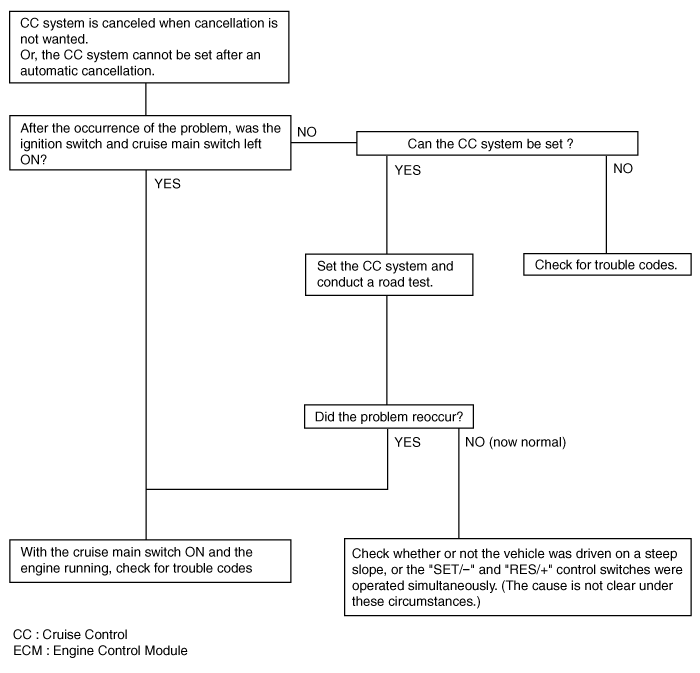 CC system can be set while driving at a vehicle speed of less than 40km/h (25mph), or there is no automatic cancellation at that speed