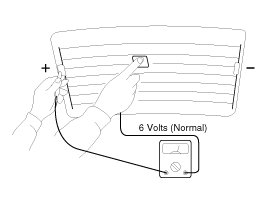 Turn on the defogger switch and use a voltmeter to measure the voltage of each heater line at the glass center point. If a voltage of approximately 6V is indicated by the voltmeter, the heater line of the rear window is considered satisfactory.