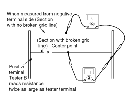 Use an ohmmeter to measure the resistance of each heater line between a terminal and the center of a grid line, and between the same terminal and the center of one adjacent heater line. The section with a broken heater line will have a resistance twice as that in other sections. In the affected section, move the test lead to a position where the resistance sharply changes.