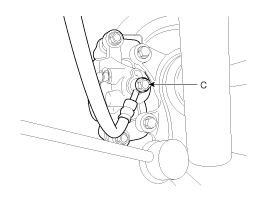 Disconnect the brake hose from the brake caliper by loosening the bolt (C).