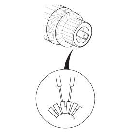 Check with an ohmmeter that no continuity exists between the commutator (A) and armature coil core (B), and between the commutator and armature shaft (C). If continuity exists, replace the armature.