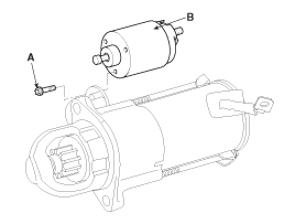 After loosening the 3 screws (A), detach the starter solenoid assembly (B).