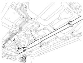 Remove the catalytic converter (A) and the center muffler (B).