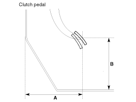 Confirm that the measuring values of the free play of the clutch pedal and the distance between the clutch pedal which is disconnected from the master cylinder and the floor board, are within the standard values.