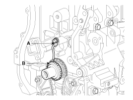 Set the crankshaft so that the key (A) of crankshaft will be aligned with the mating surface of main bearing cap. Put the intake and exhaust camshaft assembly so that the TDC marks (B) of the intake and exhaust CVVT sprockets will be aligned with the top surface of cylinder head. As a result of this, the piston of No.1 cylinder is placed at the top dead center on compression stroke.