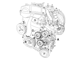 Remove the idler (A) and drive belt tensioner pulley (B).