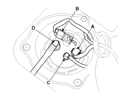 Disconnect the fuel pump connector (A) and the fuel tank pressure sensor connector (B).