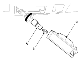 Turn the license bulb socket (A) counterclockwise to remove the bulb (B) from lens (C).