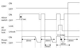 On condition of IGN1 switch ON, turn Door Lock Relay output ON within T1 when keeping more than setting speed in (1). But, do not output LOCK if all DOORS are LOCKED or FAIL at first.