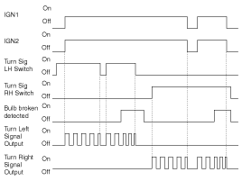 If the Left (or Right) turn switch is active and if IGN2 is On, the left (or Right) turn signal outputs are driven.