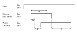 In a state of IGN2 switch=ON, If Washer switch is ON during T1, Wiper low relay is turned ON T2 after Washer switch=ON. Wiper low relay is turned OFF T3 after Washer switch=OFF.