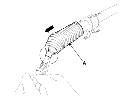 After making the space to the bellows and tie-rod end contact part by using the (-) driver, remove the bellows (A) in the direction of the arrow.(The left and right same work)