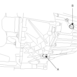 Drain the manual transaxle fluid after removing the transaxle drain plug(A). It can be easier when the oil filler plug(B) is removed.
