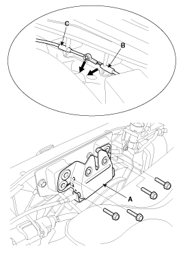After loosening the hood latch (D) mounting bolts, adjust the latch by moving it up or down, or right or left.