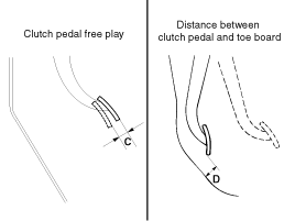 Confirm that the measuring values of the free play of the clutch pedal and the distance between the clutch pedal which is disconnected from the master cylinder and the floor board, are within the standard values.