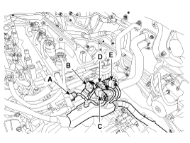 Disconnect the fuel hose (A), brake booster vacuum hose (B) and heater hoses (C).