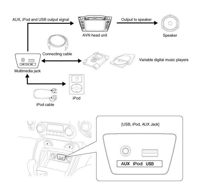 TUCSON(LM) >2013 > G 2.0 DOHC > Body Electrical System > AVN System > AUX(Auxiliary) Jack>Description and Operation | ![]() ![]() |