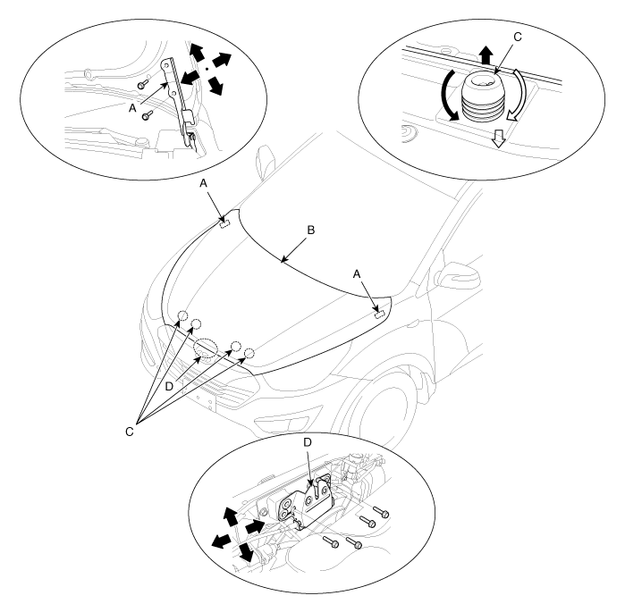After loosening the hood latch (D) mounting bolts, adjust the latch by moving it up or down, or right or left.