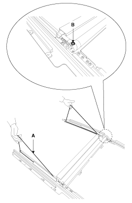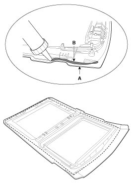 Pack adhesive into the cartridge without air pockets to ensure continuous delivery. Put the cartridge in a caulking gun, and run a bead of sealant (B) around the edge of the panoramaroof (A) as shown. Apply the adhesive within 30 minutes after applying the glass primer. Make a slightly thicker bead at each corner.