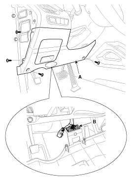 After loosening the crash pad lower panel mounting screws, then remove the crash pad lower panel (A).