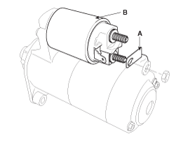 After loosening the 3 screws (A), detach the starter solenoid assembly (B).