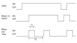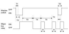 In a state of IGN2 switch=ON, If Washer switch is ON during T1, Wiper low relay is turned ON T2 after Washer switch=ON. Wiper low relay is turned OFF T3 after Washer switch=OFF.
