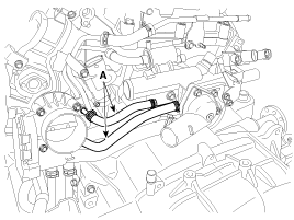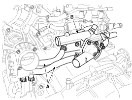 Disconnect the oil cooler hoses (A) and then remove the water temperature control assembly (B).