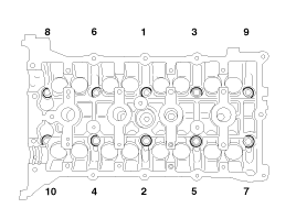 Using hexagon wrench, install and tighten the 10 cylinder head bolts and plate washers, in several passes, in the sequence shown.