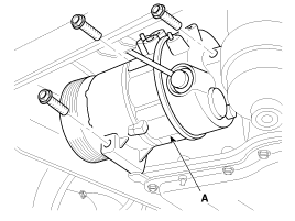 Disconnect the compressor clutch connector and then remove 3 mounting bolts and the compressor (A).