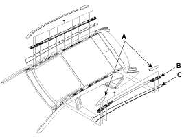 The roof panel (A) should be even with the glass (B) weatherstrip, to within the standard value "E" all the way around. If not, make the following adjustment.