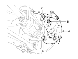 Loosen the hose eyebolt (B) and caliper mounting bolts (C), then remove the front caliper assembly (A).