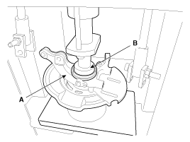 Lay the hub assembly and tool (A) upon a suitable adapter (B).