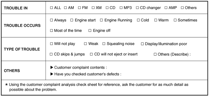 TUCSON(LM) >2012 > G 2.4 DOHC > Body Electrical System > Audio>Troubleshooting | ![]() ![]() |