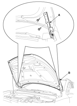 Loosen the hood hinge (A) mounting bolts, remove the hood (B).