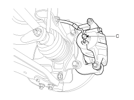Disconnect the brake hose from the brake caliper by loosening the bolt (C).