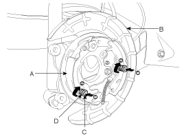 After installing the strut (A) and upper return spring (B), install the adjuster assembly (C) and the lower return spring (D).