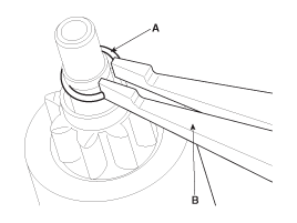 Using a suitable pulling tool (A), pull the overrunning clutch stopper (C) over the stop ring (B).