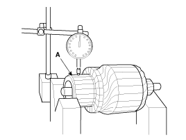 Check the commutator (A) surface. If the surface is dirty or burnt, resurface with emery cloth or a lathe within the following specifications, or recondition with #500 or #600 sandpaper (B).