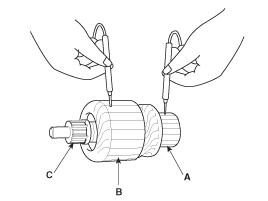 Check with an ohmmeter that no continuity exists between the commutator (A) and armature coil core (B), and between the commutator and armature shaft (C). If continuity exists, replace the armature.