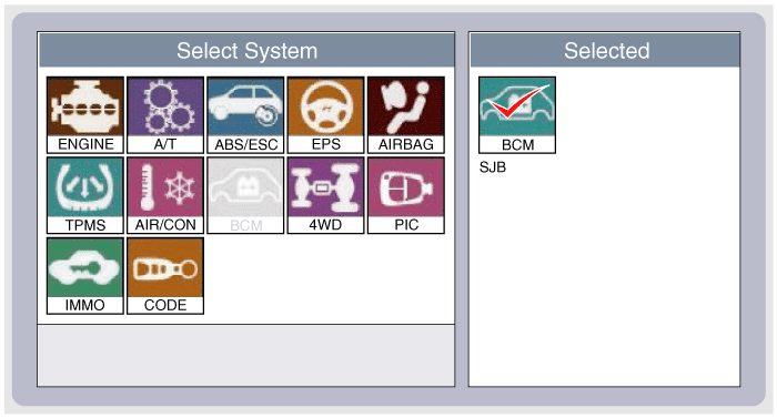 To diagnose the SJB function, select the vehicle model, BCM and SJB.