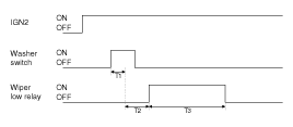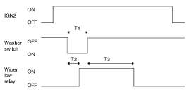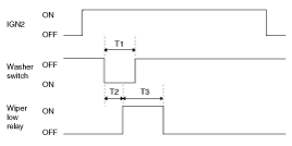 In a state of IGN2 switch=ON, If Washer switch is ON during T1, Wiper low relay is turned ON T2 after Washer switch=ON. Wiper low relay is turned OFF T3 after Washer switch=OFF.