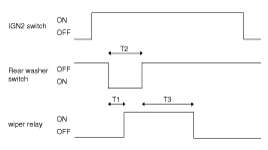 If IGN2 switch=ON and Rear washer switch is turned on during T2, Rear wiper relay is turned ON T1 after Rear washer switch=ON. And Rear wiper relay is OFF after T3.