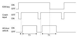 On condition of IGN1 switch ON, turn Door Lock Relay output ON within T1 when keeping more than setting speed in (1). But, do not output LOCK if all DOORS are LOCKED or FAIL at first.