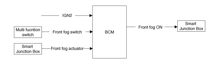 In case of (IGN2=ON) & (HeadLampLow=ON) & (HeadLampHigh=Off), if Front fog lamp switch input is detected (FrontFogSW=On), Front fog lamp output (FrontFogON=On) is turned ON.