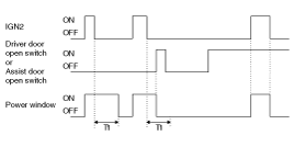 If IGN2 switch=ON and Rear washer switch is ON more than T2, Rear wiper relay is turned ON later T1 after Rear washer switch=ON. And Rear wiper relay is turned OFF after T3 from Rear washer switch=OFF.